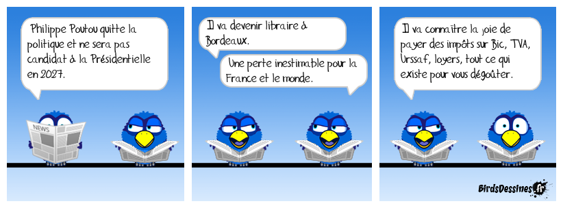 Case 1:Bird 1: Philippe Poutou quitte la politique et ne sera pas candidat à la Présidentielle en 2027. | Case 2: Bird 1: Il va devenir libraire à Bordeaux. Bird 2: Une perte inestimable pour la France et le monde. | Case 3: Bird 1: Il va connaître la joie de payer des impôts sur Bic, TVA, Urssaf, loyers, tout ce qui existe pour vous dégoûter.