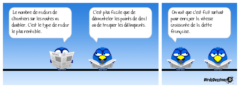 Case 1:Bird 1: Le nombre de radars de chantiers sur les routes va doubler. C'est le type de radar le plus rentable. | Case 2: Bird 1: C'est plus facile que de démanteler les points de deal ou de traquer les délinquants. | Case 3: Bird 1: On voit que c'est fait surtout pour enrayer la vitesse croissante de la dette française.