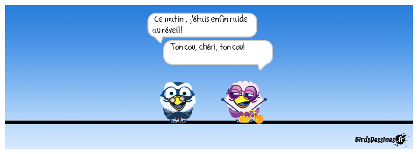 Case 1: | Case 2: Bird 1: Ce matin , j'étais enfin raide au réveil! Bird 2: Ton cou, chéri, ton cou! | Case 3: