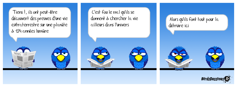 Case 1:Bird 1: Tiens !, ils ont peut-être découvert des preuves d'une vie extraterrestre sur une planète à 124 années lumière | Case 2: Bird 1: C'est fou le mal qu'ils se donnent à chercher la vie ailleurs dans l'univers | Case 3: Bird 1: Alors qu'ils font tout pour la détruire ici
