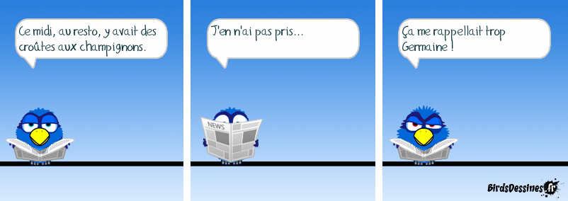 Case 1:Bird 1: Ce midi, au resto, y avait des croûtes aux champignons. Case 2:Bird 1: J'en n'ai pas pris... Case 3:Bird 1: Ça me rappellait trop Germaine !