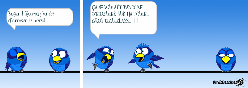 Case 1:Bird 1: Roger ! Quand j’ai dit d’arroser le persil… Case 2:Bird 1: ÇA NE VOULAIT PAS DIRE D’EJACULER SUR MA MOULE… GROS DEGUEULASSE !!! Case 3: