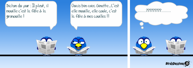 Case 1:Bird 1: Dicton du jour : Il pleut, il mouille c’est la fête à la grenouille ! Case 2:Bird 1: Ouais bin avec Ginette…C’est elle mouille, elle coule, c’est la fête à mes couilles !! Case 3:Bird 1: .......?????????........