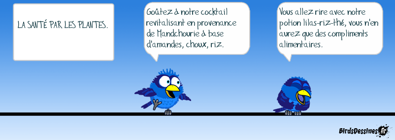 Case 1:Bird 1: LA SANTÈ PAR LES PLANTES. Case 2:Bird 1: Goûtez à notre cocktail revitalisant en provenance de Mandchourie à base d'amandes, choux, riz. Case 3:Bird 1: Vous allez rire avec notre potion lilas-riz-thé, vous n'en aurez que des compliments alimentaires.