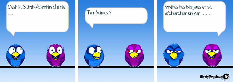 Case 1:Bird 1: C'est la Saint-Valentin chérie .... Case 2:Bird 1: Tu m'aimes ? Case 3:Bird 1: Arrêtes tes blagues et va m'chercher un ver .......