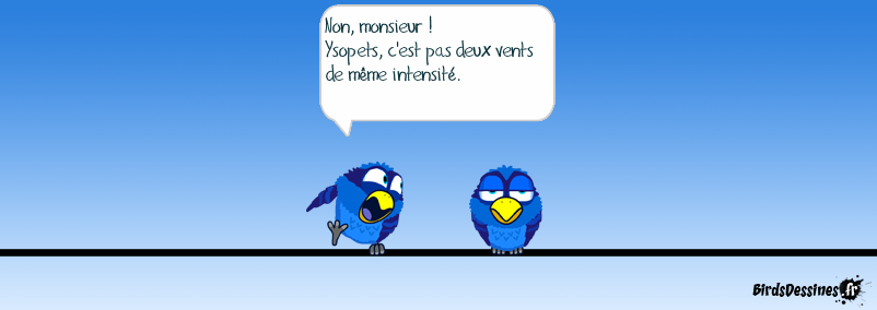 Case 1: Case 2:Bird 1: Non, monsieur ! Ysopets, c'est pas deux vents de même intensité. Case 3: