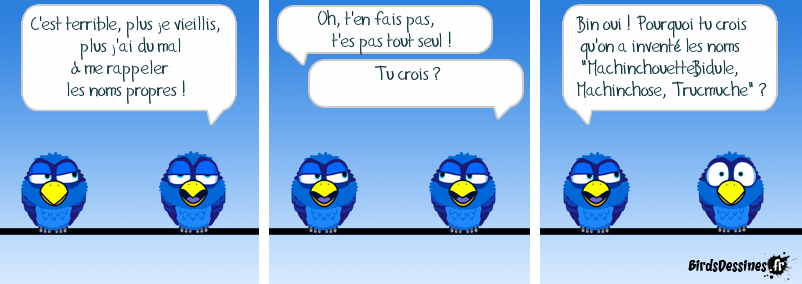 Case 1:Bird 1: C'est terrible, plus je vieillis, plus j'ai du mal à me rappeler les noms propres ! Case 2:Bird 1: Oh, t'en fais pas, t'es pas tout seul !Bird 2: Tu crois ? Case 3:Bird 1: Bin oui ! Pourquoi tu crois qu'on a inventé les noms "Machinchouette,Bidule, Machinchose, Trucmuche" ?