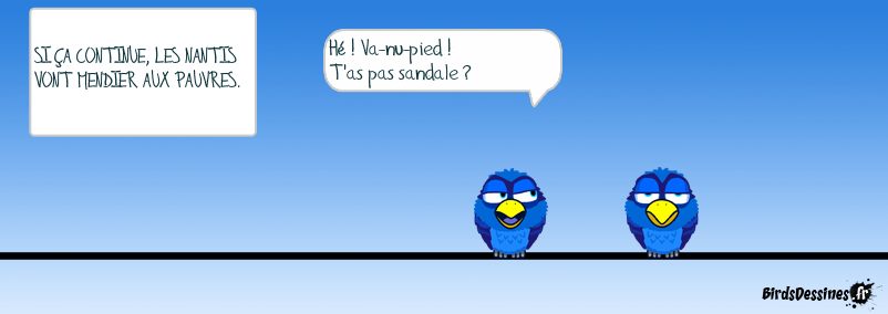 Case 1:Bird 1: SI ÇA CONTINUE, LES NANTIS VONT MENDIER AUX PAUVRES. Case 2:Bird 1: Hé ! Va-nu-pied ! T'as pas sandale ? Case 3: