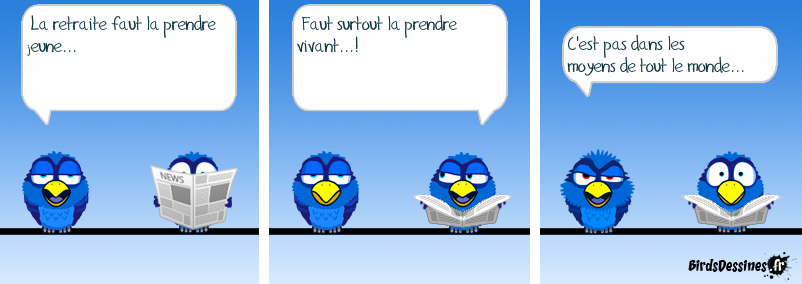 Case 1:Bird 1: La retraite faut la prendre jeune... Case 2:Bird 1: Faut surtout la prendre vivant...! Case 3:Bird 1: C'est pas dans les moyens de tout le monde...