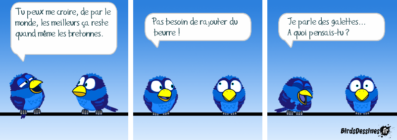 Case 1:Bird 1: Tu peux me croire, de par le monde, les meilleurs ça reste quand même les bretonnes. Case 2:Bird 1: Pas besoin de rajouter du beurre ! Case 3:Bird 1: Je parle des galettes... A quoi pensais-tu ?