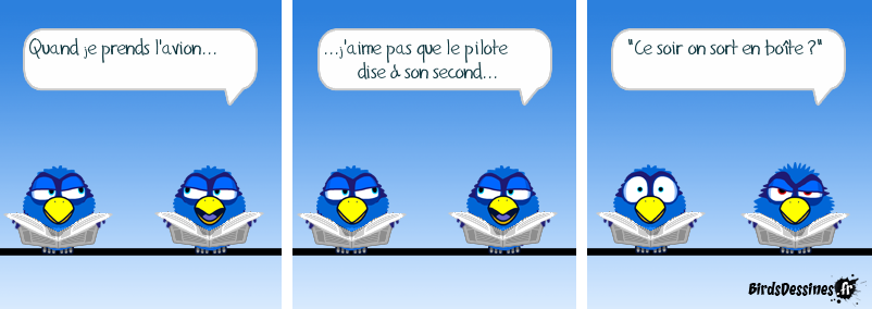 Case 1:Bird 1: Quand je prends l'avion... Case 2:Bird 1: ...j'aime pas que le pilote dise à son second... Case 3:Bird 1: "Ce soir on sort en boïte ?"