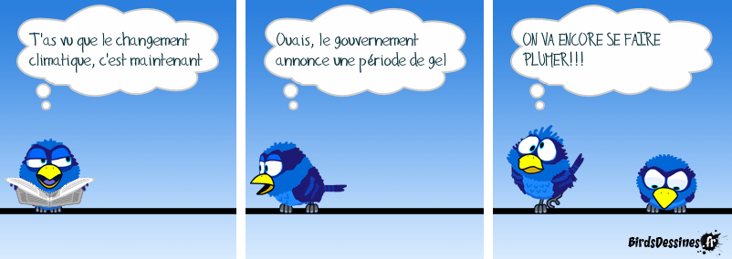Case 1:Bird 1: T'as vu que le changement climatique, c'est maintenant Case 2:Bird 1: Ouais, le gouvernement annonce une période de gel Case 3:Bird 1: ON VA ENCORE SE FAIRE PLUMER!!!