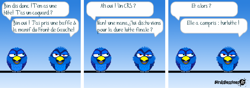 Case 1:Bird 1: Bin dis donc !T'en as une tête! T'as un coquard ?Bird 2: Bin oui ! J'ai pris une baffe à la manif du Front de Gauche! Case 2:Bird 1: Ah oui ! Un CRS ?Bird 2: Nan! une nana,j'lui dis:tu viens pour la dure lutte finale ? Case 3:Bird 1: Et alors ?Bird 2: Elle a compris : turlutte !