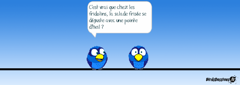 Case 1: Case 2:Bird 1: C'est vrai que chez les fridolins, la salade frisée se déguste avec une pointe d'heil ? Case 3: