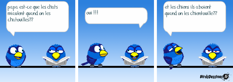 Case 1:Bird 1: papa est-ce que les chats miaulent quand on les chatouilles?? Case 2:Bird 1: oui !!! Case 3:Bird 1: et les chiens ils aboient quand on les chientouille??
