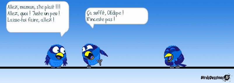 Case 1:Bird 1: Allez, maman, s'te plait !!! Allez, quoi ! Juste un peu ! Laisse-toi faire, allez ! Case 2:Bird 1: Ça suffit, OEdipe ! N'inceste pas ! Case 3: