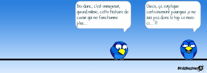 Case 1: Case 2:Bird 1: Dis-donc, c'est ennuyeux, quand même, cette histoire de coeur qui ne fonctionne plus... Case 3:Bird 1: Ouais, ça explique certainement pourquoi je ne suis pas dans le top ce mois-ci... !!