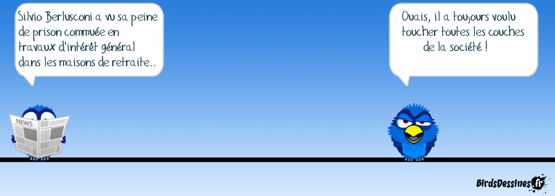 Case 1:Bird 1: Silvio Berlusconi a vu sa peine de prison commuée en travaux d'intérêt général dans les maisons de retraite.. Case 2: Case 3:Bird 1: Ouais, il a toujours voulu toucher toutes les couches de la société !
