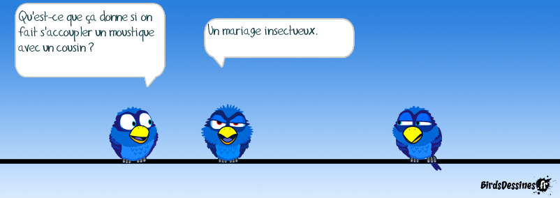 Case 1:Bird 1: Qu'est-ce que ça donne si on fait s'accoupler un moustique avec un cousin ? Case 2:Bird 1: Un mariage insectueux. Case 3: