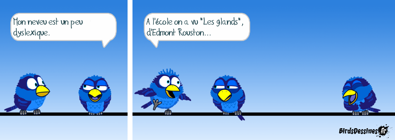 Case 1:Bird 1: Mon neveu est un peu dyslexique. Case 2:Bird 1: A l'école on a vu "Les glands", d'Edmont Rouston... Case 3: