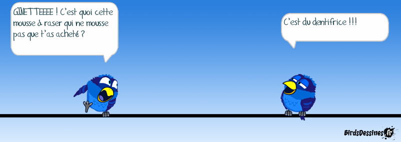 Case 1:Bird 1: GINETTEEEE ! C’est quoi cette mousse à raser qui ne mousse pas que t’as acheté ? Case 2: Case 3:Bird 1: C’est du dentifrice !!!