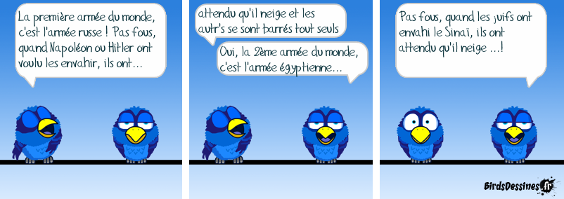 Case 1:Bird 1: La première armée du monde, c'est l'armée russe ! Pas fous, quand Napoléon ou Hitler ont voulu les envahir, ils ont... Case 2:Bird 1: attendu qu'il neige et les autr's se sont barrés tout seulsBird 2: Oui, la 2ème armée du monde, c'est l'armée égyptienne... Case 3:Bird 1: Pas fous, quand les juifs ont envahi le Sinaî, ils ont attendu qu'il neige ...!