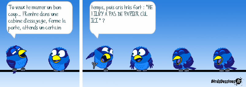 Case 1:Bird 1: Tu veux te marrer un bon coup… !Rentre dans une cabine d'essayage, ferme la porte, attends un certain Case 2:Bird 1: temps, puis cris très fort : "HE ! ILN'Y A PAS DE PAPIER CUL ICI " ? Case 3: