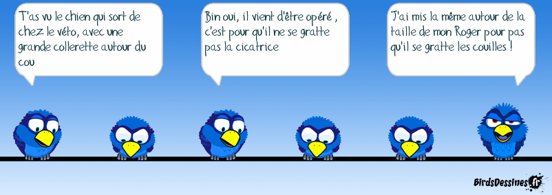 Case 1:Bird 1: T'as vu le chien qui sort de chez le véto, avec une grande collerette autour du cou Case 2:Bird 1: Bin oui, il vient d'être opéré , c'est pour qu'il ne se gratte pas la cicatrice Case 3:Bird 1: J'ai mis la même autour de la taille de mon Roger pour pas qu'il se gratte les couilles !