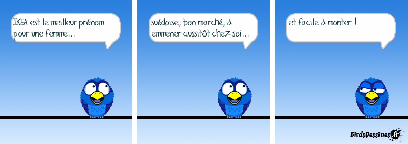 Case 1:Bird 1: IKEA est le meilleur prénom pour une femme... Case 2:Bird 1: suédoise, bon marché, à emmener aussitôt chez soi... Case 3:Bird 1: et facile à monter !