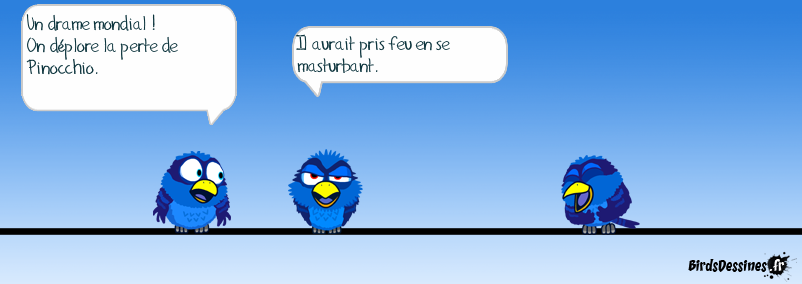 Case 1:Bird 1: Un drame mondial ! On déplore la perte de Pinocchio. Case 2:Bird 1: Il aurait pris feu en se masturbant. Case 3:
