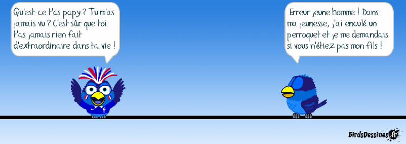Case 1:Bird 1: Qu'est-ce t'as papy ? Tu m'as jamais vu ? C'est sûr que toi t'as jamais rien fait d'extraordinaire dans ta vie ! Case 2: Case 3:Bird 1: Erreur jeune homme ! Dans ma jeunesse, j'ai enculé un perroquet et je me demandais si vous n'étiez pas mon fils !