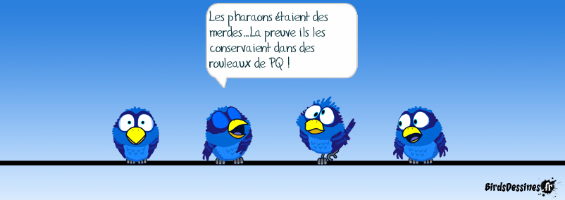 Case 1: Case 2:Bird 1: Les pharaons étaient des merdes…La preuve ils les conservaient dans des rouleaux de PQ ! Case 3: