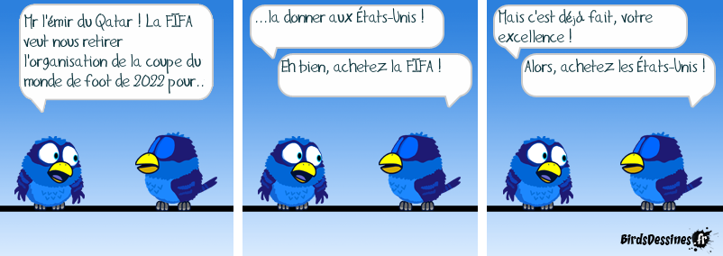 Case 1:Bird 1: Mr l'émir du Qatar ! La FIFA veut nous retirer l'organisation de la coupe du monde de foot de 2022 pour.. la Case 2:Bird 1: ...la donner aux Ètats-Unis !Bird 2: Eh bien, achetez la FIFA ! Case 3:Bird 1: Mais c'est déjà fait, votre excellence !Bird 2: Alors, achetez les Ètats-Unis !