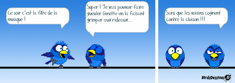 Case 1:Bird 1: Ce soir c’est la fête de la musique ! Case 2:Bird 1: Super ! Je vais pouvoir faire gueuler Ginette en la faisant grimper aux rideaux... Case 3:Bird 1: Sans que les voisins cognent contre la cloison !!!