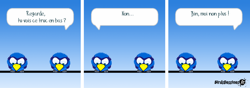 Case 1:Bird 1: Regarde, tu vois ce truc en bas ? Case 2:Bird 1: Non... Case 3:Bird 1: Bin, moi non plus !