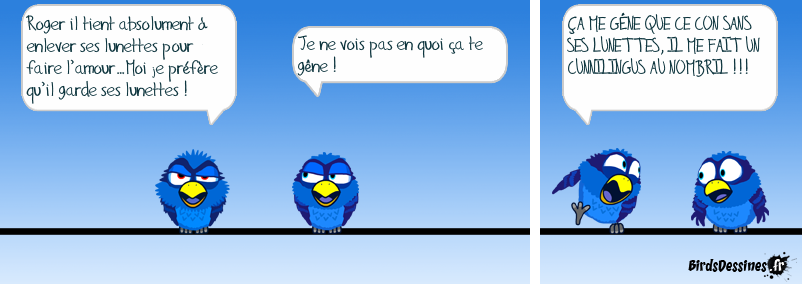 Case 1:Bird 1: Roger il tient absolument à enlever ses lunettes pour faire l’amour…Moi je préfère qu’il garde ses lunettes ! Case 2:Bird 1: Je ne vois pas en quoi ça te gêne ! Case 3:Bird 1: ÇA ME GÊNE QUE CE CON SANS SES LUNETTES, IL ME FAIT UN CUNNILINGUS AU NOMBRIL !!!