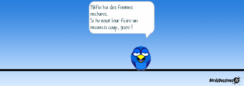 Case 1: Case 2:Bird 1: Méfie toi des femmes matures. Si tu veux leur faire un mauvais coup, gare ! Case 3: