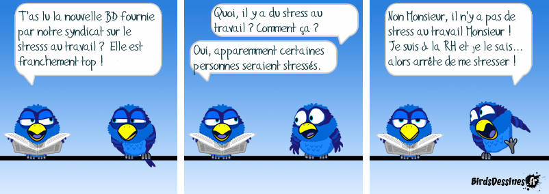 Case 1:Bird 1: T'as lu la nouvelle BD fournie par notre syndicat sur le stresss au travail ? Elle est franchement top ! Case 2:Bird 1: Quoi, il y a du stress au travail ? Comment ça ?Bird 2: Oui, apparemment certaines personnes seraient stressés. Case 3:Bird 1: Non Monsieur, il n'y a pas de stress au travail Monsieur ! Je suis à la RH et je le sais... alors arrête de me stresser !