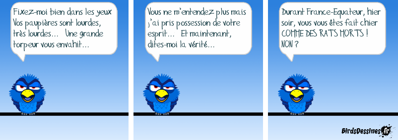 Case 1:Bird 1: Fixez-moi bien dans les yeux Vos paupières sont lourdes, très lourdes... Une grande torpeur vous envahit... Case 2:Bird 1: Vous ne m’entendez plus mais j’ai pris possession de votre esprit... Et maintenant, dites-moi la vérité... Case 3:Bird 1: Durant France-Equateur, hier soir, vous vous êtes fait chier COMME DES RATS MORTS ! NON ?