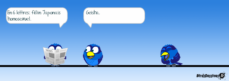 Case 1:Bird 1: En 6 lettres: félin Japonais homosexuel. Case 2:Bird 1: Geisha. Case 3: