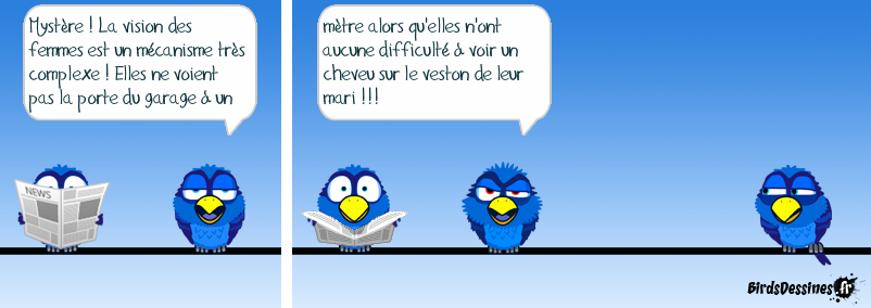 Case 1:Bird 1: Mystère ! La vision des femmes est un mécanisme très complexe ! Elles ne voient pas la porte du garage à un Case 2:Bird 1: mètre alors qu'elles n'ont aucune difficulté à voir un cheveu sur le veston de leur mari !!! Case 3: