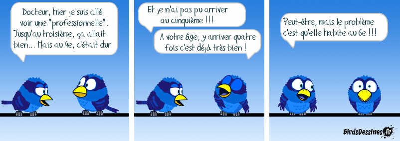Case 1:Bird 1: Docteur, hier je suis allé voir une "professionnelle". Jusqu'au troisième, ça allait bien... Mais au 4e, c'était dur Case 2:Bird 1: Et je n'ai pas pu arriver au cinquième !!!Bird 2: A votre âge, y arriver quatre fois c'est déjà très bien ! Case 3:Bird 1: Peut-être, mais le problème c'est qu'elle habite au 6e !!!