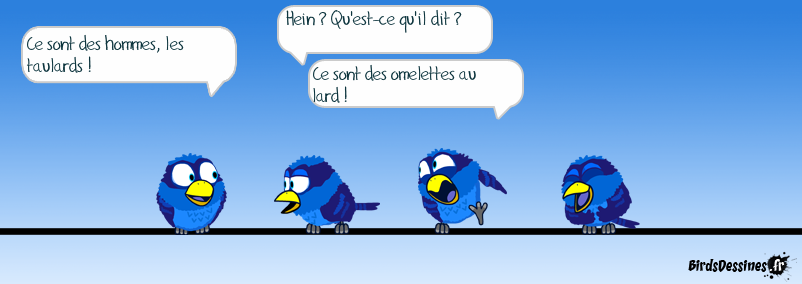 Case 1:Bird 1: Ce sont des hommes, les taulards ! Case 2:Bird 1: Hein ? Qu'est-ce qu'il dit ?Bird 2: Ce sont des omelettes au lard ! Case 3: