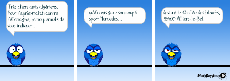 Case 1:Bird 1: Très chers amis algériens. Pour l’après-match contre l’Allemagne, je me permets de vous indiquer... Case 2:Bird 1: qu'Alconis gare son coupé sport Mercedes... Case 3:Bird 1: devant le 13 allée des bleuets, 95400 Villiers-le-Bel.