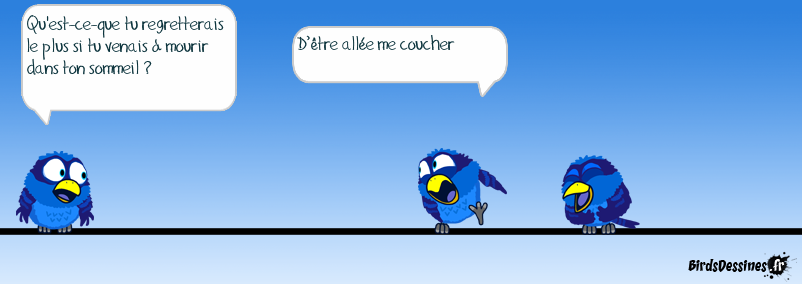 Case 1:Bird 1: Qu'est-ce-que tu regretterais le plus si tu venais à mourir dans ton sommeil ? Case 2:Bird 1: D’être allée me coucher Case 3: