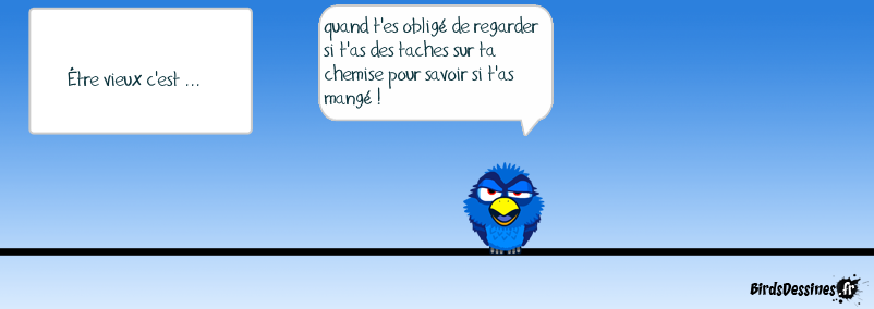 Case 1:Bird 1: Être vieux c'est ... Case 2:Bird 1: quand t'es obligé de regarder si t'as des taches sur ta chemise pour savoir si t'as mangé ! Case 3: