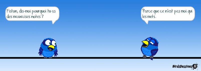 Case 1:Bird 1: Fiston, dis-moi pourquoi tu as des mauvaises notes ? Case 2: Case 3:Bird 1: Parce que ce n'est pas moi qui les mets.