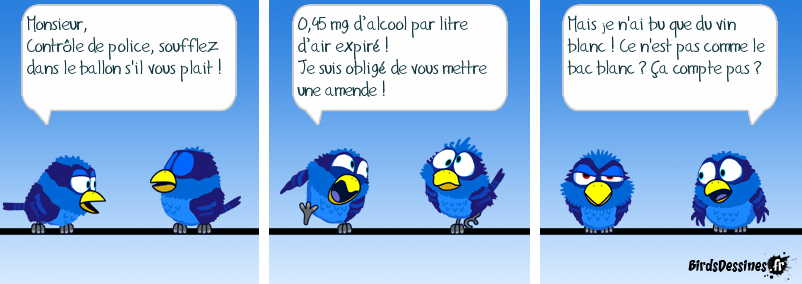Case 1:Bird 1: Monsieur, Contrôle de police, soufflez dans le ballon s'il vous plait ! Case 2:Bird 1: 0,45 mg d’alcool par litre d’air expiré ! Je suis obligé de vous mettre une amende ! Case 3:Bird 1: Mais je n'ai bu que du vin blanc ! Ce n'est pas comme le bac blanc ? Ça compte pas ?