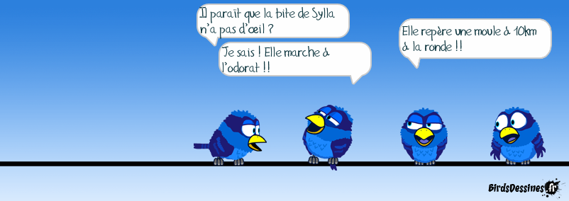 Case 1: Case 2:Bird 1: Il paraît que la bite de Sylla n’a pas d’œil ?Bird 2: Je sais ! Elle marche à l’odorat !! Case 3:Bird 1: Elle repère une moule à 10km à la ronde !!