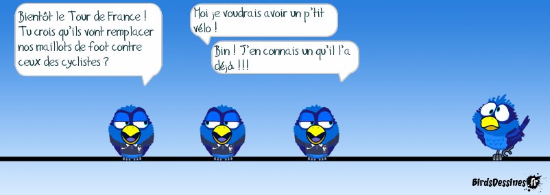 Case 1:Bird 1: Bientôt le Tour de France ! Tu crois qu’ils vont remplacer nos maillots de foot contre ceux des cyclistes ? Case 2:Bird 1: Moi je voudrais avoir un p’tit vélo !Bird 2: Bin ! J’en connais un qu’il l’a déjà !!! Case 3: